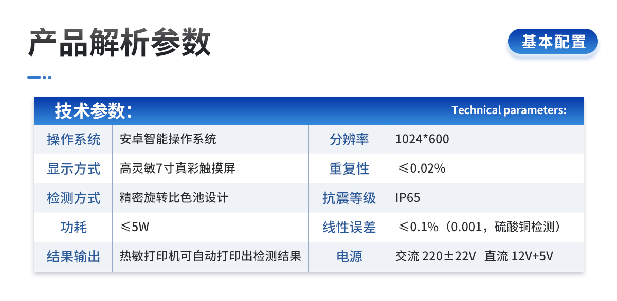| 電源:交流 220±22V 直流 12V+5V(可用車載電源也可選擇儀器內置鋰電池) | 功率: ≤5W | 量程及分辨率:0.001-9999 | 重復性誤差: ≤0.02%(0.0002,重鉻酸鉀溶液) | 儀器穩定性:兩個小時內數字漂移小于0.2%(0.002,透光度測量)。儀器開機預熱5分鐘后,一個小時內顯示數字無漂移(透光度測量),兩個小時內數字漂移不超過0.2%(0.002,透光度測量)。 | 線性誤差: ≤0.1%(0.001,硫酸銅檢測) | 靈敏度:紅光≥4.5 ×10-5 藍光≥3.17×10-3 綠光≥2.35×10-3 橙光≥2.13×10-3 | 波長范圍 :紅光:680±2nm; 藍光:420±2nm;綠光:510±2nm;橙光:590±10nm | PH值(酸堿度): (1)測試范圍:1~14 (2)精度:0.01 (3)誤差:±0.1 | 肥料中氮(N)、磷(P)、鉀(K)等養分同時、快速、準確檢測 | 測試速度:測一個肥料樣(N、P、K)≤50分鐘(含前處理時間,不需用戶提供任何附件) | 同時測5個肥料樣≤2小時(含前處理時間) | 數據打印:內置新型一鍵式熱敏打印機 |