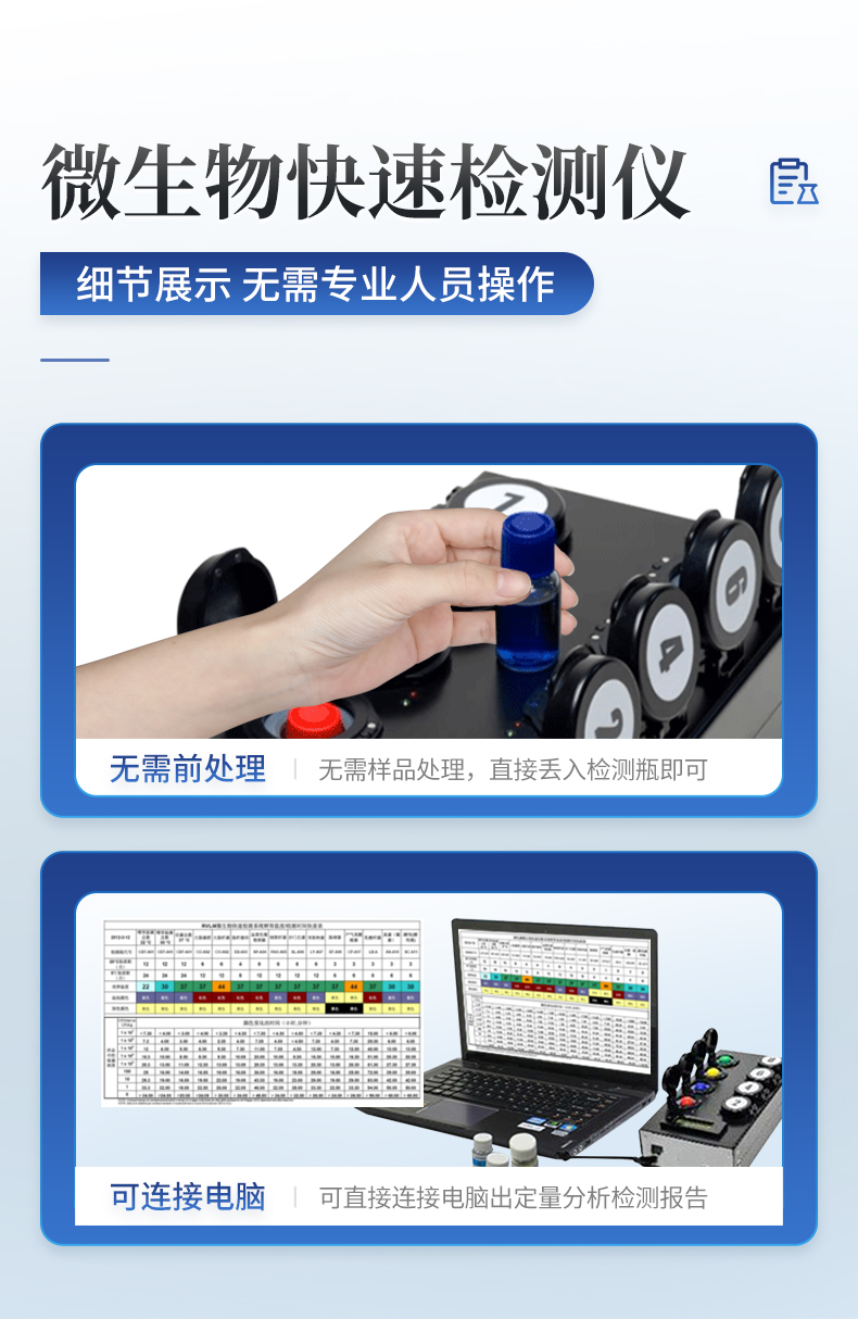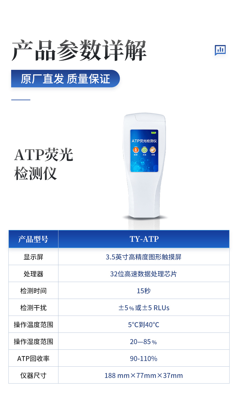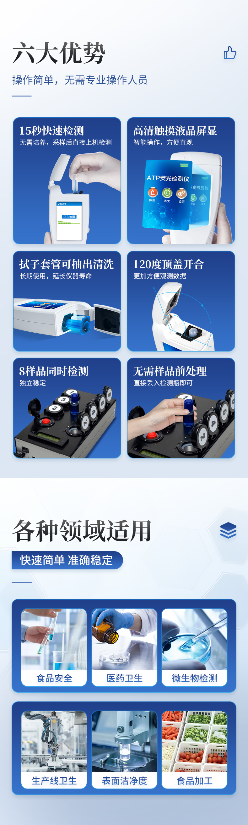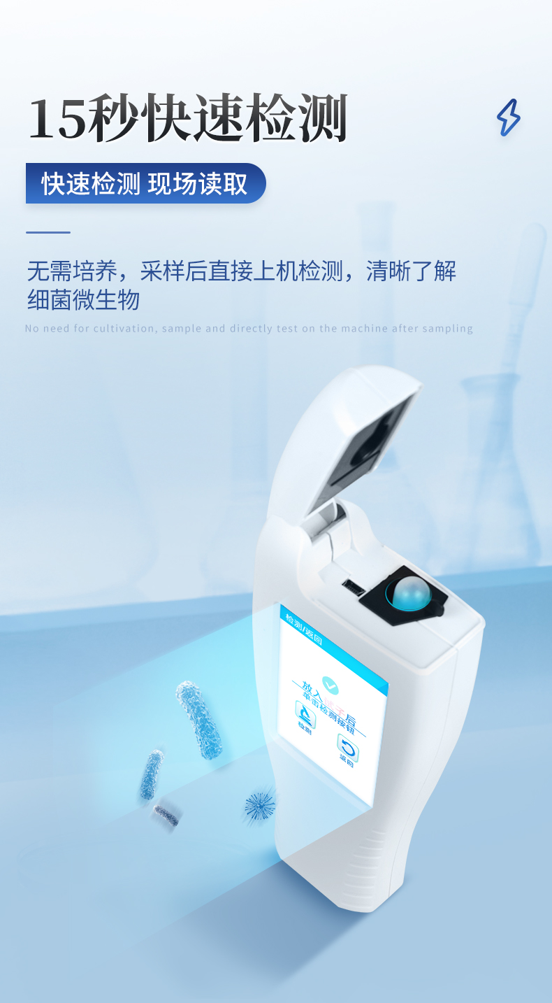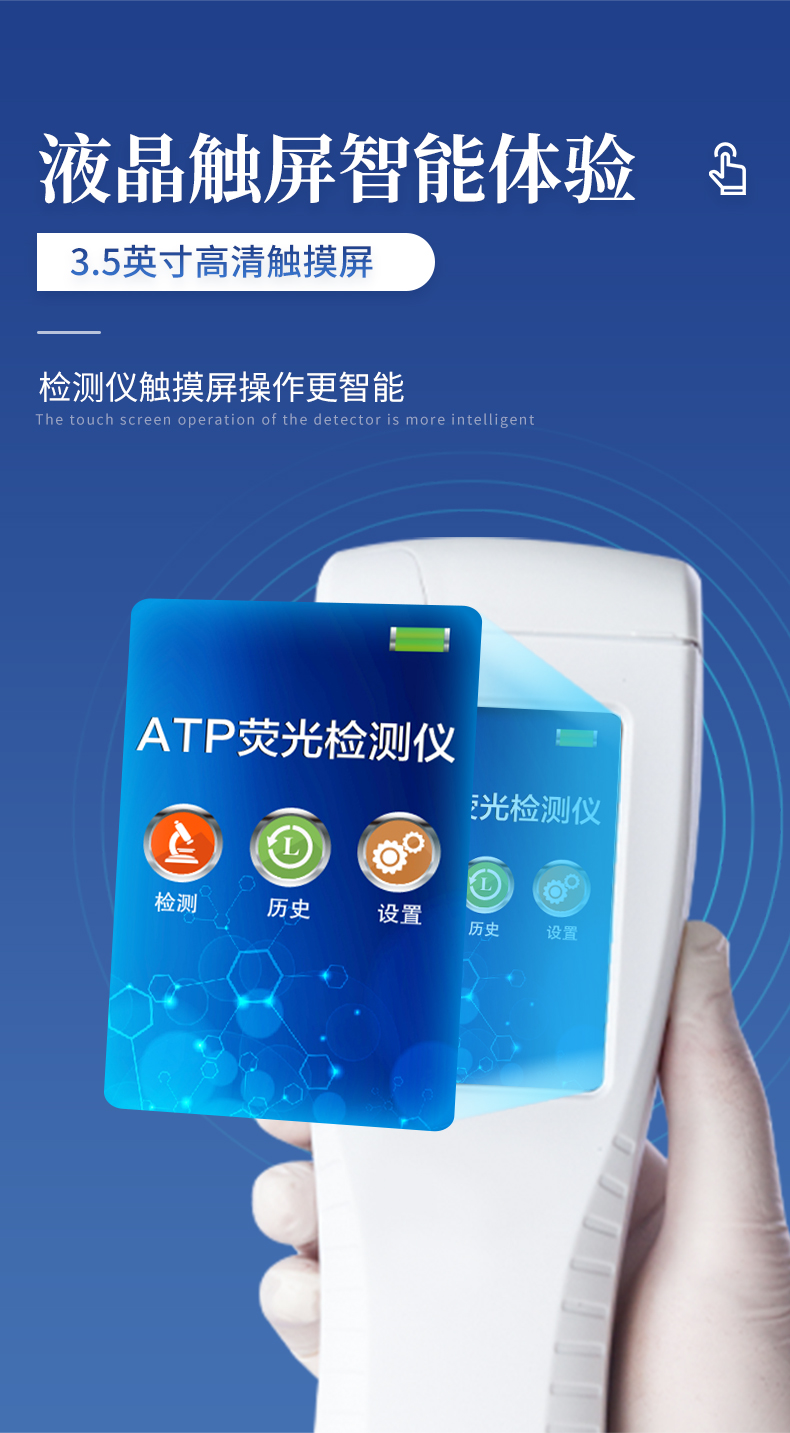 該設備為全新升級產品,大屏幕觸摸顯示屏,代替傳統按鍵。操作采用生物化學反應方法檢測ATP含量,ATP熒光檢測儀基于螢火蟲發光原理,利用“熒光素酶—熒光素體系”快速檢測三磷酸腺苷(ATP)。ATP拭子含有可以裂解細胞膜的試劑,能將細胞內ATP釋放出來,與試劑中含有的特異性酶發生反應,產生光,再用熒光照度計檢測發光值,微生物的數量與發光值成正比,由于所有生物活細胞中含有恒量的ATP,所以ATP含量可以清晰地表明樣品中微生物與其他生物殘余的多少,用于判斷衛生狀況。
