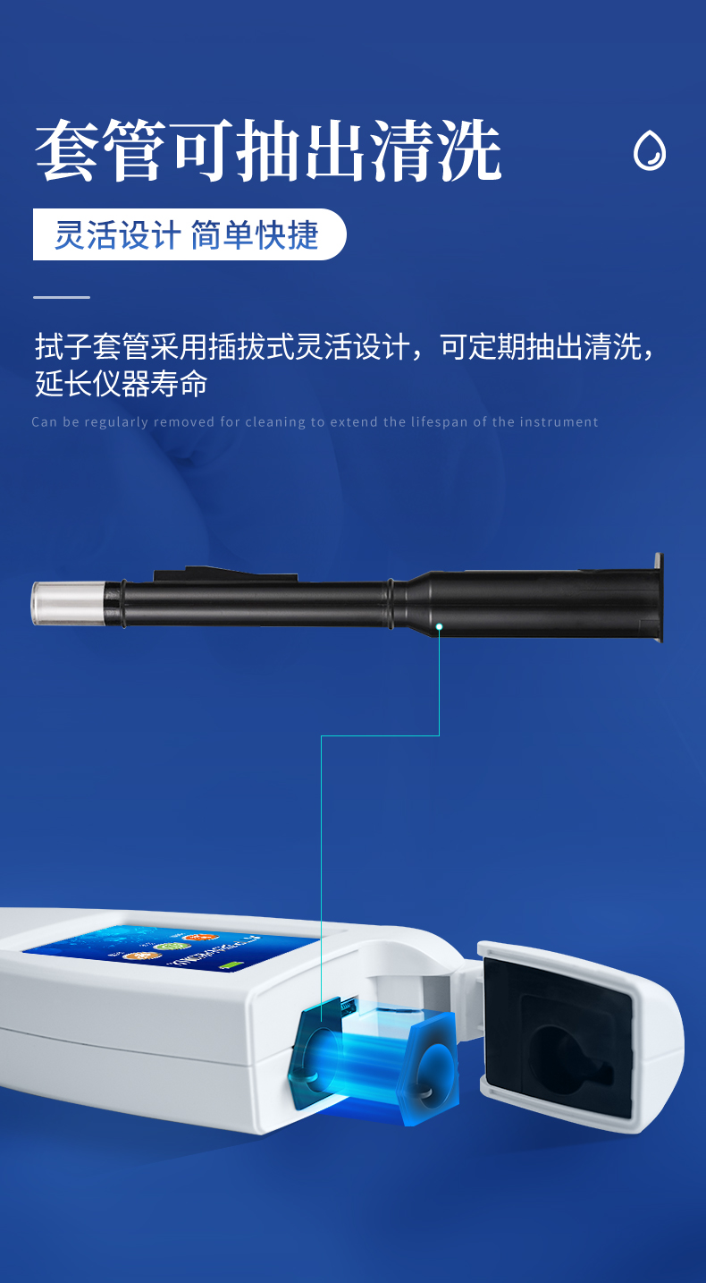 實用性 —— 可根據環境檢測需求設定上下限值,做到數據快速評估預警,表面潔凈度快速篩查。靈敏度高 —— ***************速度快 —— 常規培養法18-24h以上,而ATP只需要十幾秒鐘 .可行性 —— 微生物數量與微生物體內所含ATP有明確的相關性。 通過檢測ATP含量,可間接得出反應中微生物數量可操作性 —— 傳統培養方法需要在實驗室由經過培訓的技術人員進行操作;而ATP快速潔凈度檢測操作非常簡便,只需簡單的培訓即可由一般工作人員進行現場操作。體驗更好 —— 試子套管采用插拔式靈活設計,可定期清洗長期使用,延長儀器壽命。